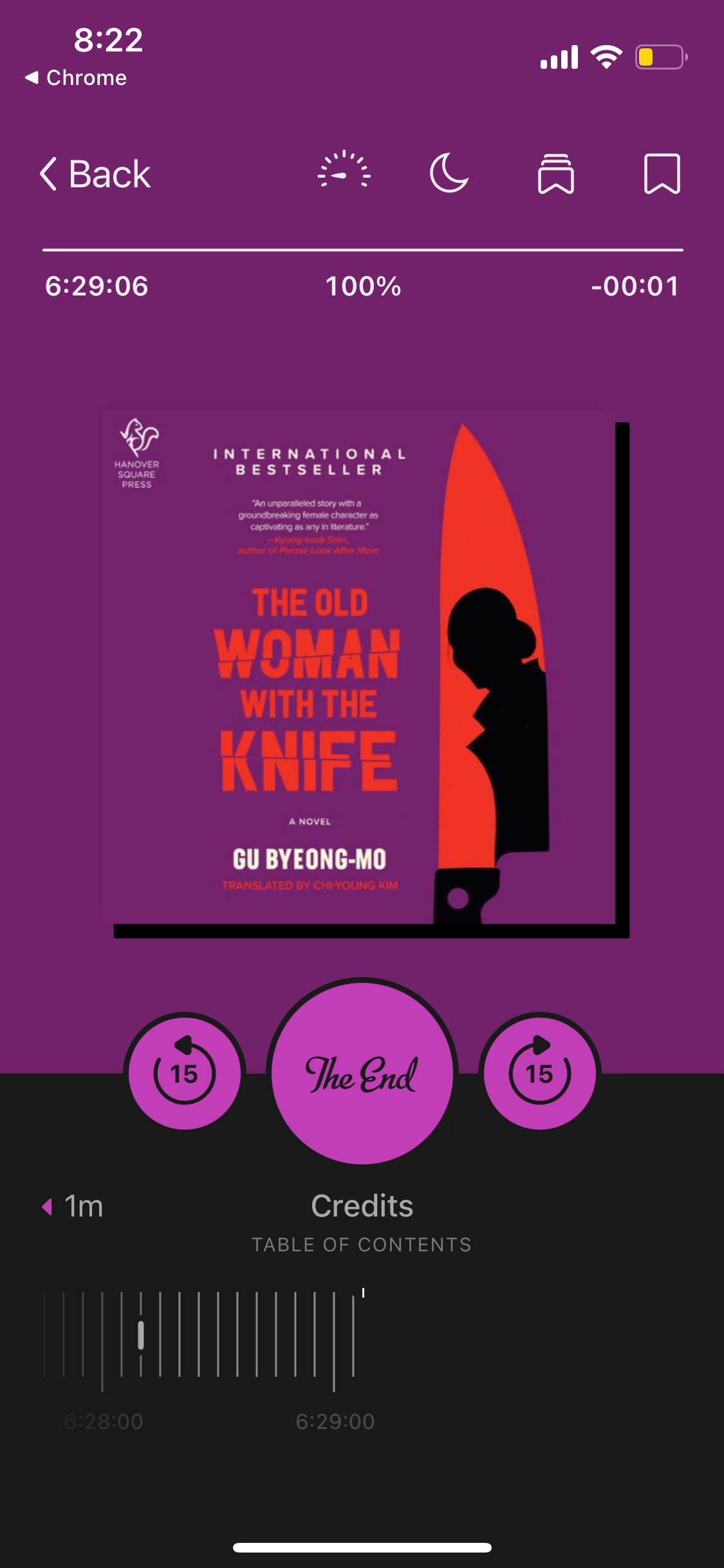 6/7/25. Very strange book about an aging assassin. Interesting insight in what it means to be an old woman in society, with a bunch of action. The characters weren't super well developed but it was a fun listen.